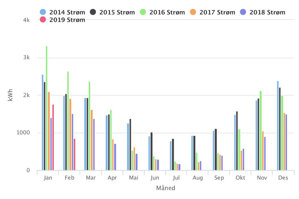 * Installasjon av varmepumpe som eneste varmekilde for kjøkken og stuer (samt fjerning av den gamle avtrekksvifta i stueveggen) har vist seg å være en god investering. Se graf over strømforbruk de siste årene: